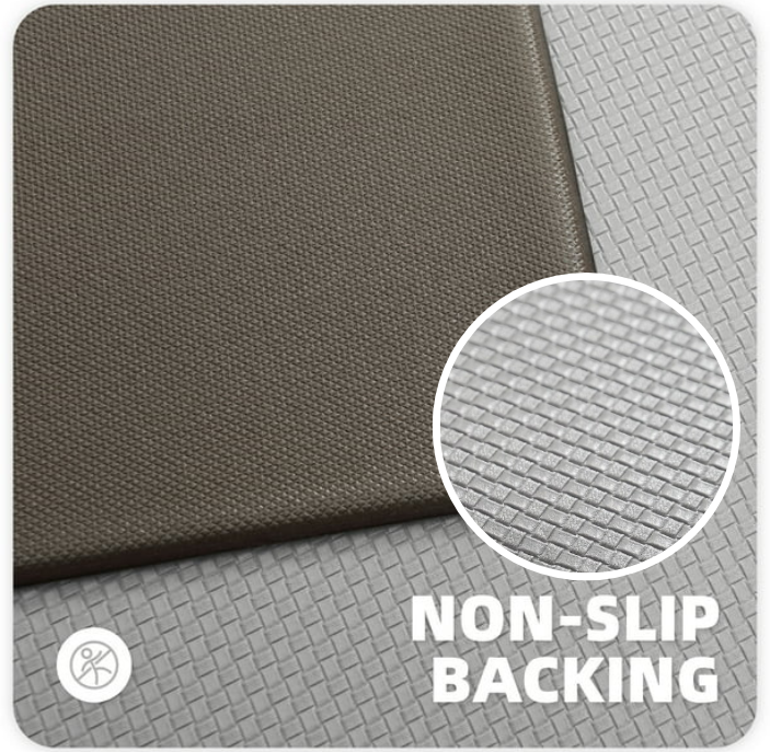 The Floorfinity Kitchen Mat has a specially treated rubber bottom with unique tread design that firmly grips any surface. Unlike traditional floormats that can slide around, fold, or crumple, our mat sticks flat to the floor.