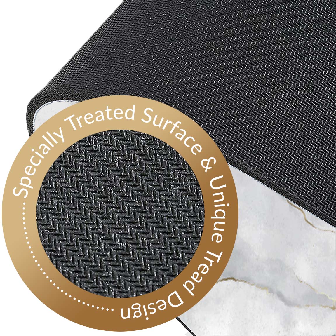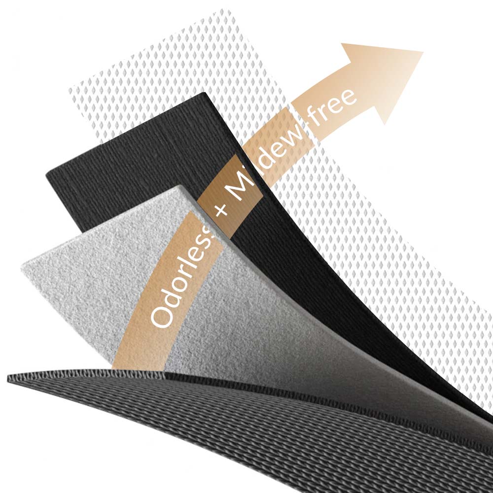 • The bottom layer features a specially treated rubber surface with a unique tread design, ensuring that the mat always locks in place.